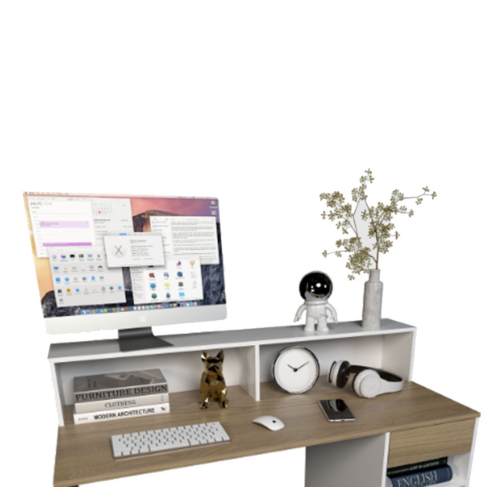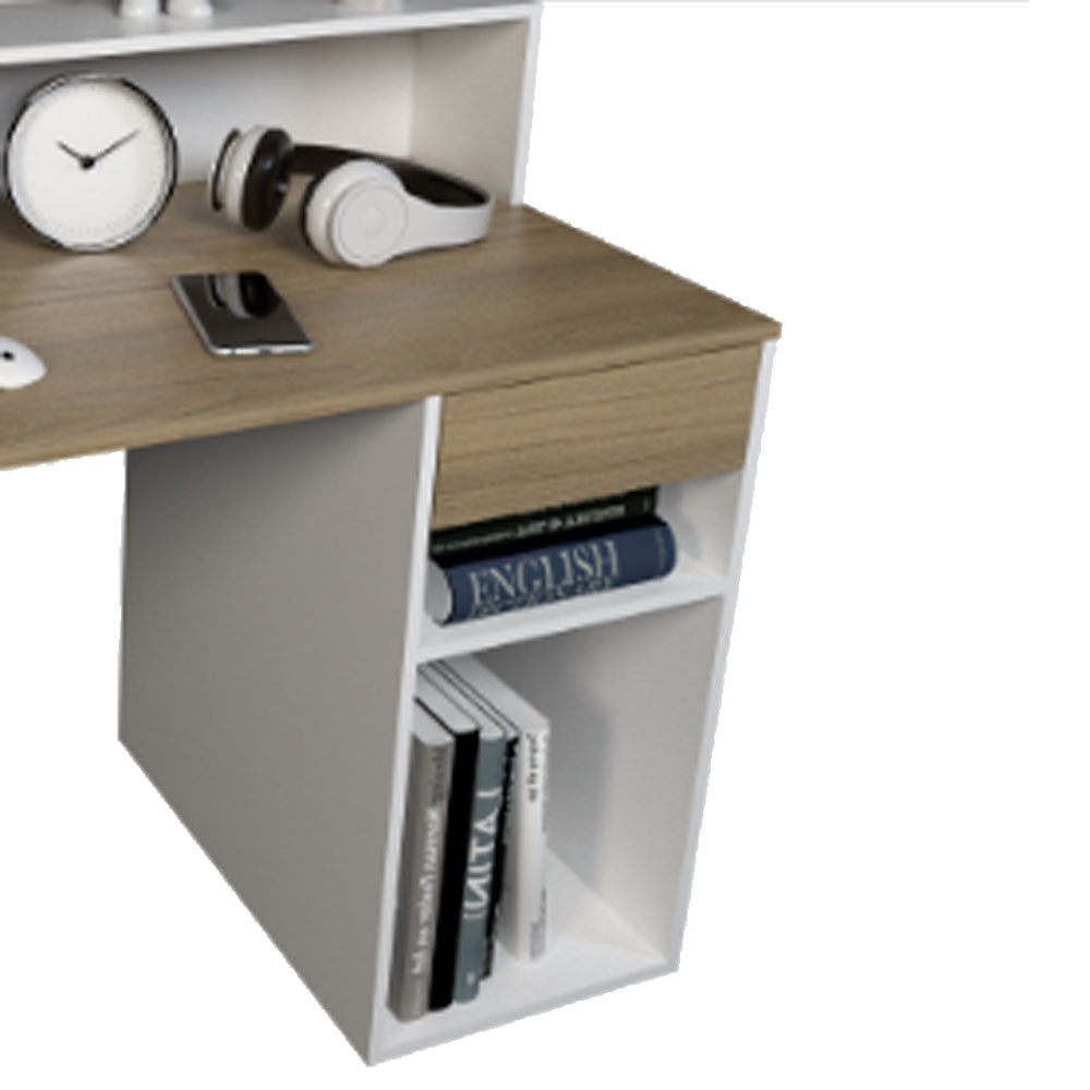 Un escritorio compacto y funcional, ideal para oficina, estudio o habitación. Está fabricado en melamina resistente, con 1 cajón con corredera metálica y una repisa superior para libros, carpetas u otros objetos. Sus medidas aproximadas son 135 cm de largo 75 cm de alto 60 cm de profundidad, lo que lo hace práctico en espacios medianos. Además, su diseño en tono Olmo|Everest le aporta un estilo moderno y neutro que combina con distintos ambientes.