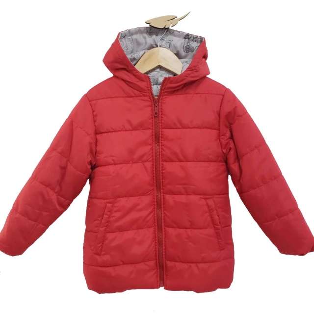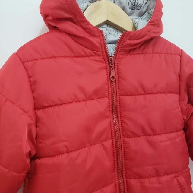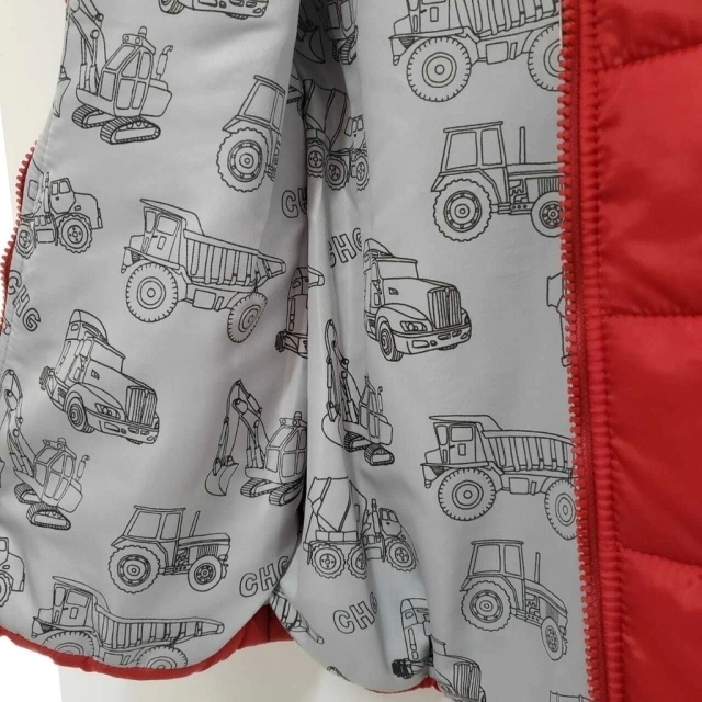 Campera de abrigo color rojo. Interior con estampas de tractores color gris. Con capucha. Talle 1 equivale a 12 meses; talle 2 de 18 a 24 meses.