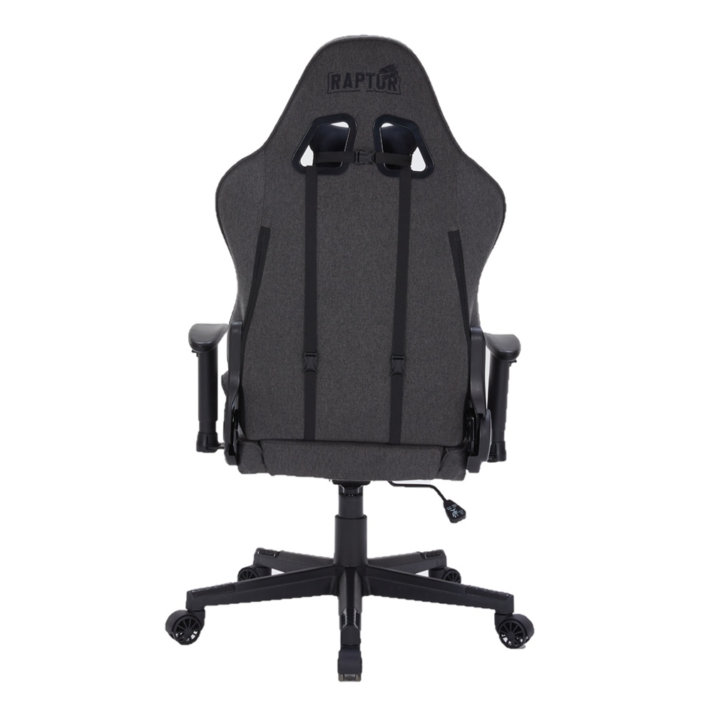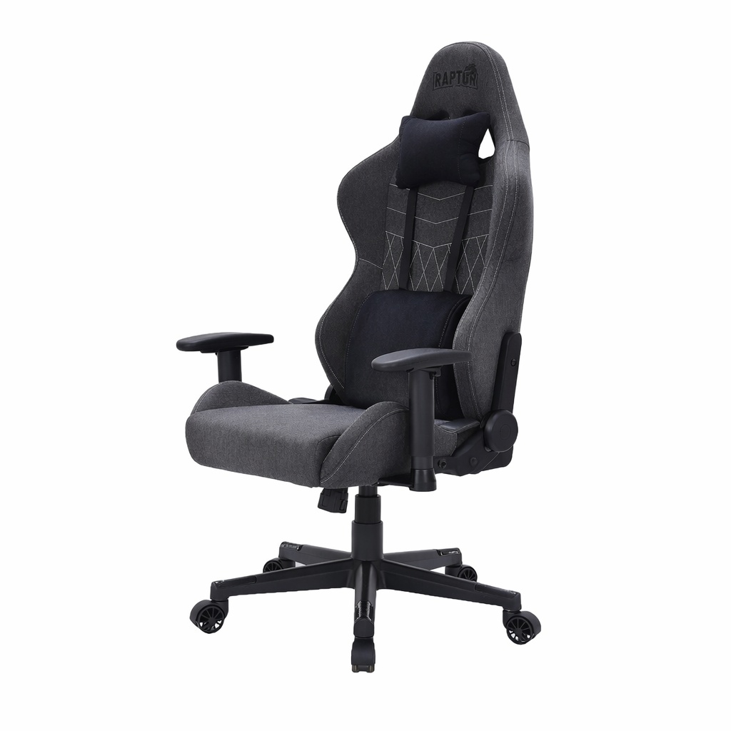 Silla gamer de estilo ergonómico con tapizado en tela negra, respaldo alto reclinable y cojines lumbar y cervical. Su asiento es regulable en altura, tiene apoyabrazos ajustables y ruedas para fácil movilidad. Ideal para largas sesiones de juego o trabajo cuidando la postura.