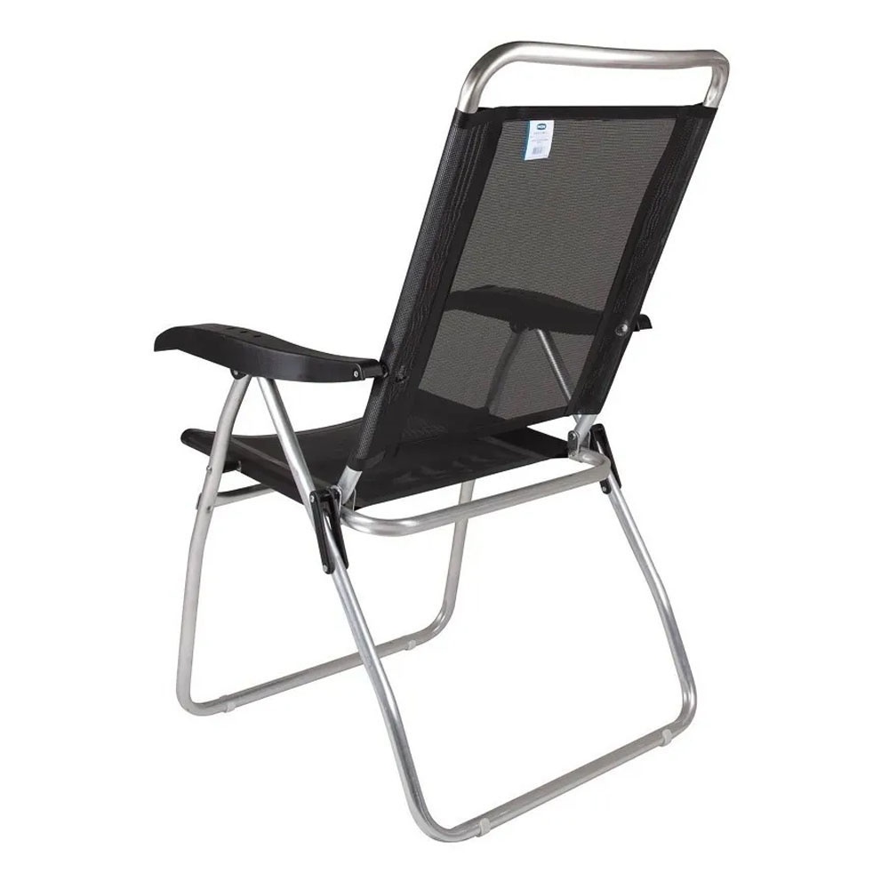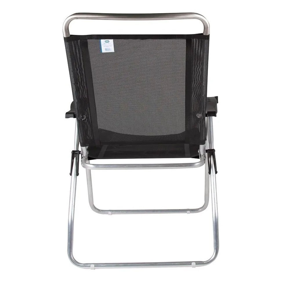 Cuenta con asiento de polipropileno y poliéster revestido en PVC, lo que garantiza durabilidad y fácil mantenimiento. Su diseño reclinable con 4 posiciones, apoyabrazos plásticos y formato plegable la convierte en una excelente opción para playa, camping, jardín o piscina. Soporta hasta 110 kg y se destaca por su portabilidad y color negro elegante.