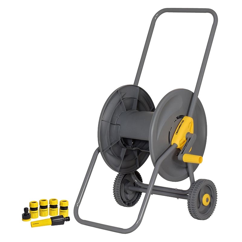 CARRO ENROLLA MANGUERA - 2 RUEDAS + ACCESORIOS 197 ft. (60 metros) Incluye: 1 Boquilla para riego ajustable 4 Conectores acople rápido para manguera de 12,5 mm 1 Conector roscado para canillas de 12,5 mm-Estructura de caño reforzada -Carretel porta manguera -Empuñadura intercambiable derecha|izquierda -Ruedas para traslado
