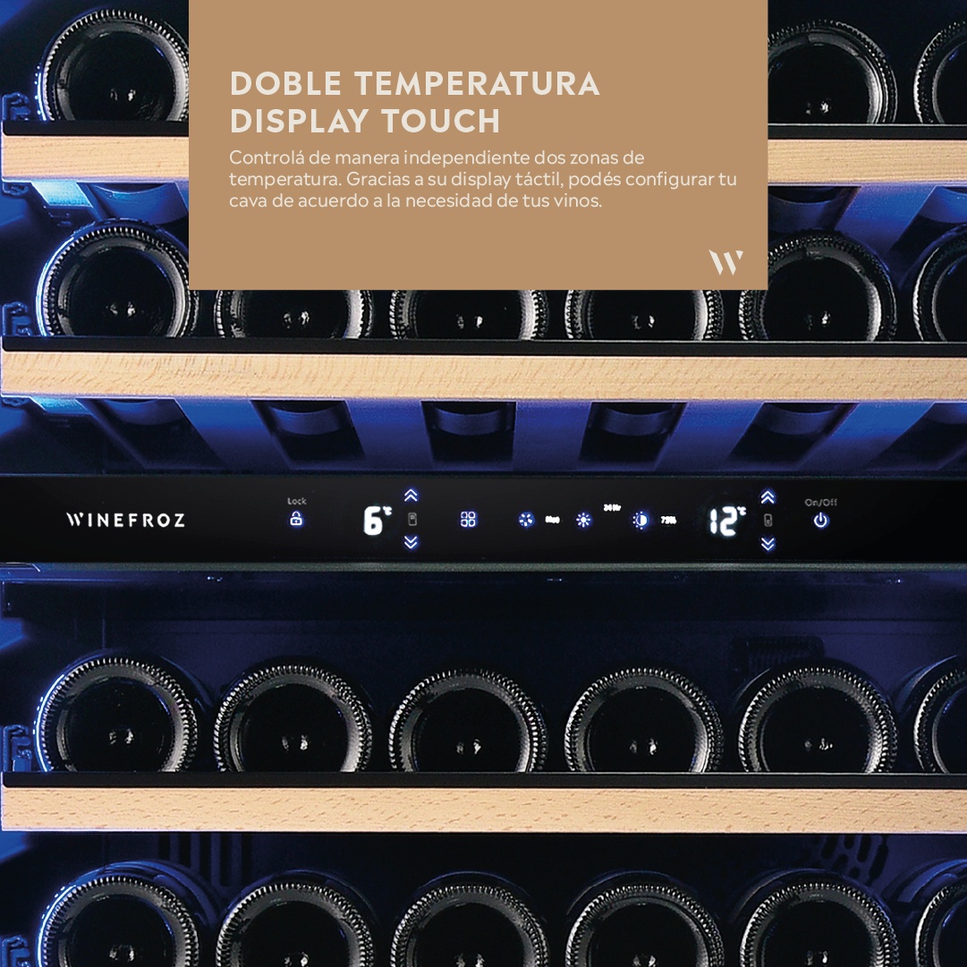 Ofrece control de DOBLETEMPERATURA, con rangos ajustables de 5C a 18C en el compartimento superior y 5C a 18 C en el inferior, optimizando la conservación según el tipo de vino.