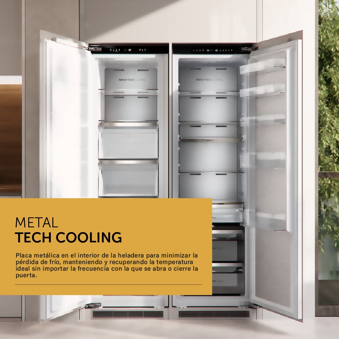 La tecnología Metal Tech Cooling es una placa metálica en el interior del equipo que minimiza la pérdida de frío, manteniendo y recuperando la temperatura ideal sin importar la frecuencia con la que se abra o cierre la puerta.
