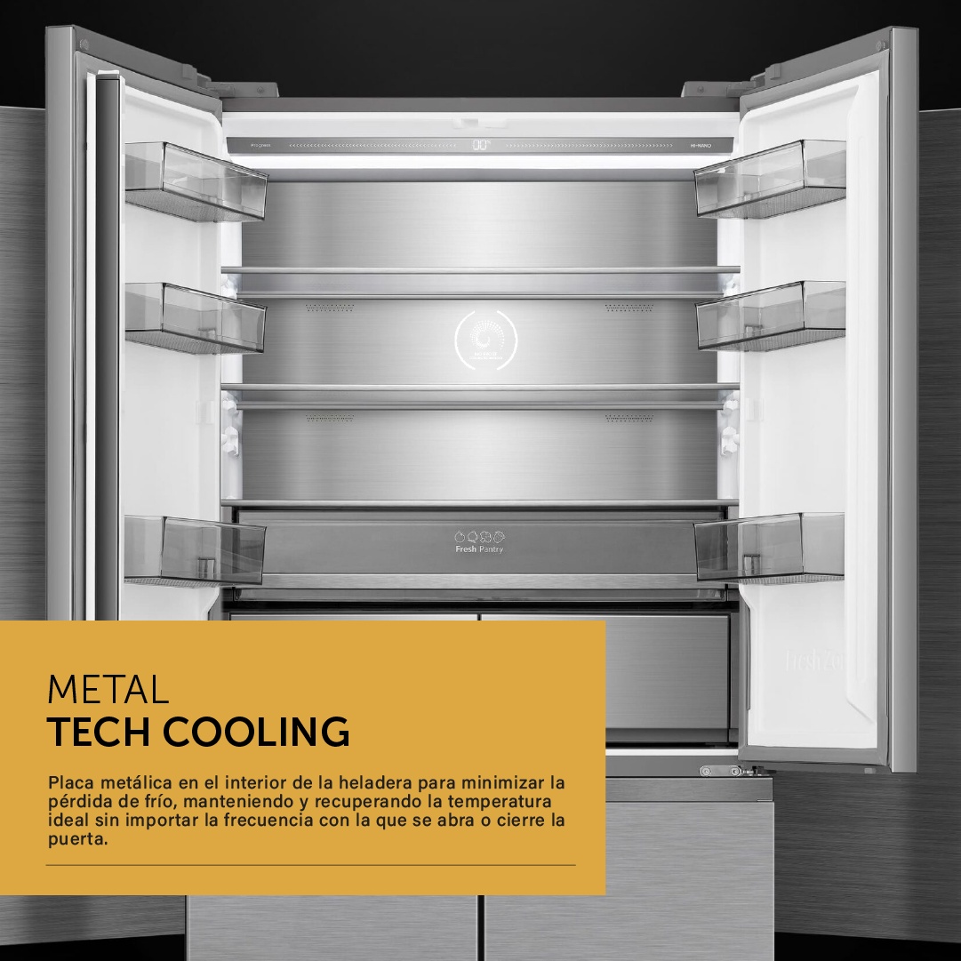 Además, cuenta con tecnologíaMetal Coolingque utiliza superficies metálicas para distribuir el frío de manera uniforme y mantener la temperatura constante. Conserva tus alimentos frescos por más tiempo, reduce el consumo energético y aporta un diseño moderno a tu cocina.