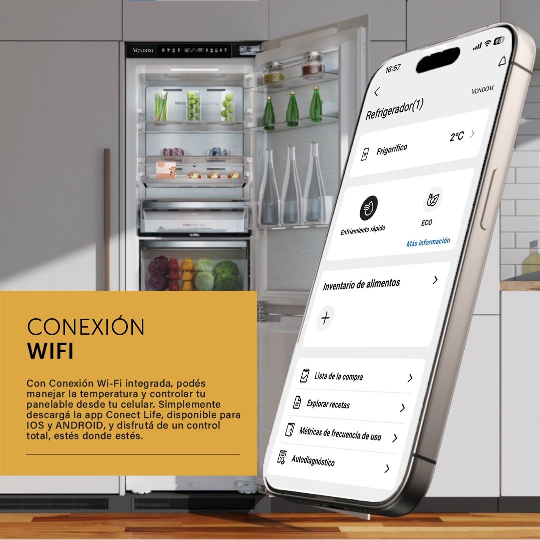 Descubrí la Heladera Panelable WIFI Inverter No Frost 300 litros de Vondom. Esta heladera se integra con los muebles de tu cocina, preservando el diseño de tu espacio.