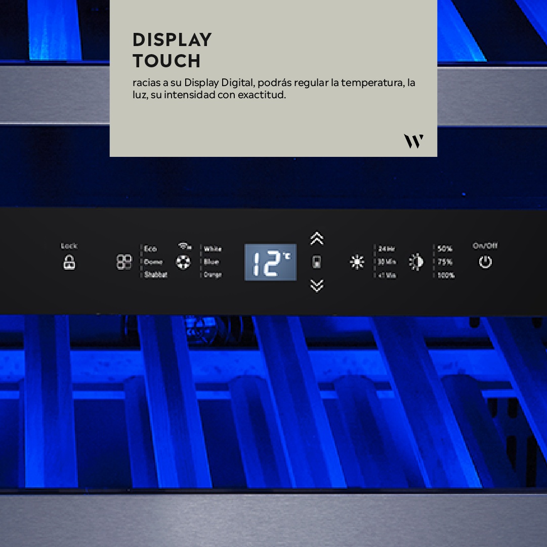 La nueva línea WIFI LUXURY EDITIONdeWINEFROZ permite elegir la intensidad y el color de la luz interior (rojo, blanco o azul). elegir el modo de funcionamiento (Estándar|Eco|Shabbat) y seleccionar el tiempo deluz encendida, entre otras funciones.