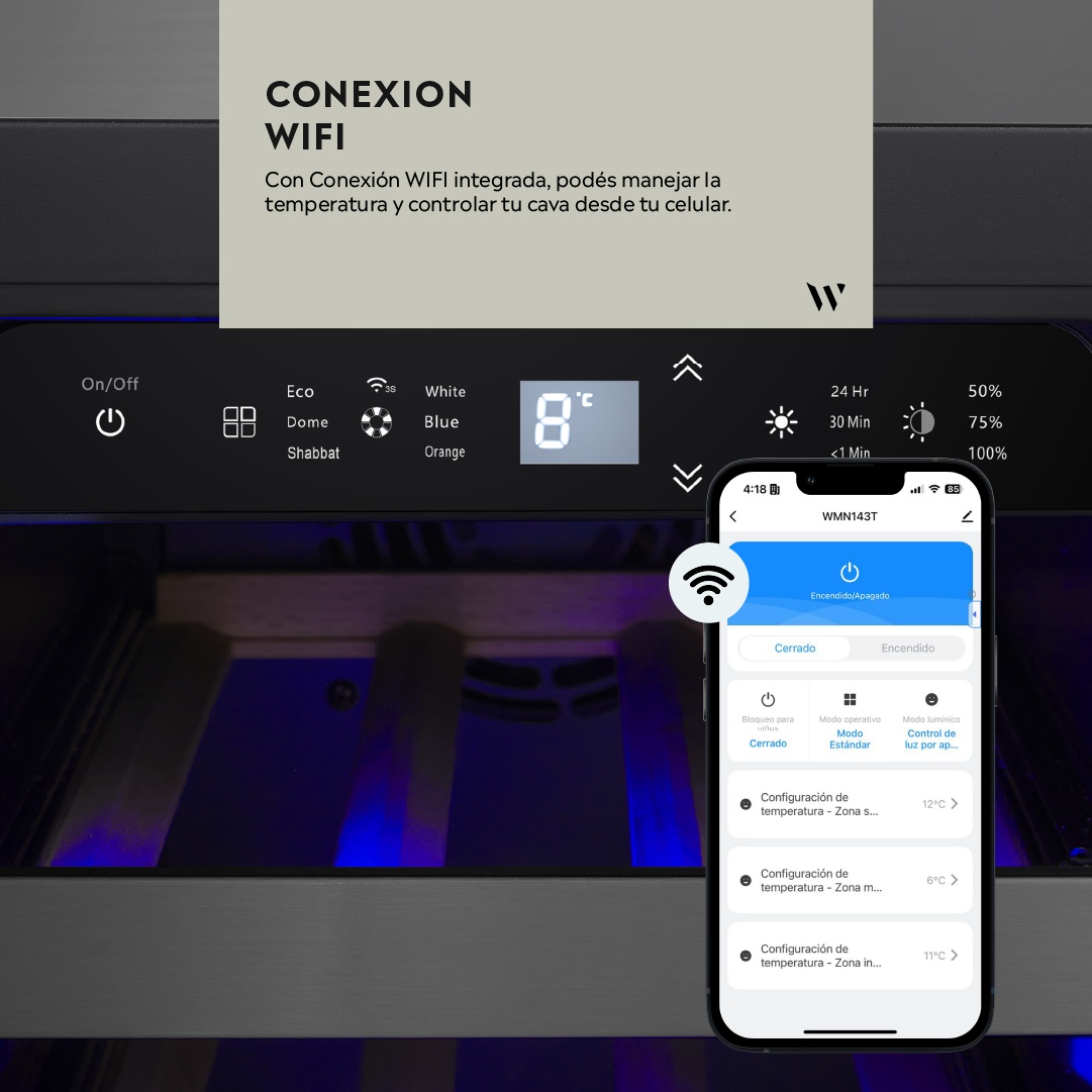 La nueva línea WIFI LUXURY EDITIONdeWINEFROZpermite controlar tu cava de vinos desde tu teléfono celularmanteniendoel equilibrio ideal entre temperatura, iluminación y humedad.