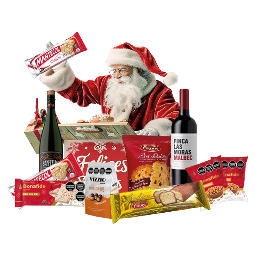 2 MANTECOL BAJO SODIO 111GR. GEORGALOS1 TURRÓN CREMONA DE MANÍ X80GR. BONAFIDE2 GARRAPIÑADAS X100GR. BONAFIDE1 MANÍ CROCANTE X80GR VIZZIO. BONAFIDE1 PAN DULCE X400GR FRANCE. FIRENZE1 BUDÍN X150GR FRANCE. FIRENZE1 VINO MALBEC 750CC. FINCA LAS MORAS1 ESPUMANTE EXTRA BRUT. SAN TELMO1 CAJA NAVIDEÑA