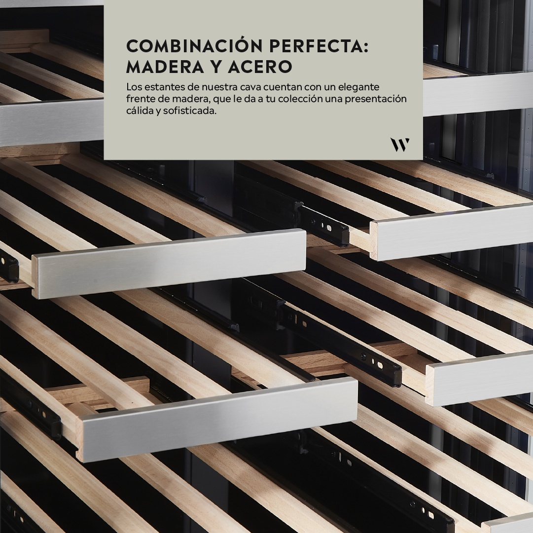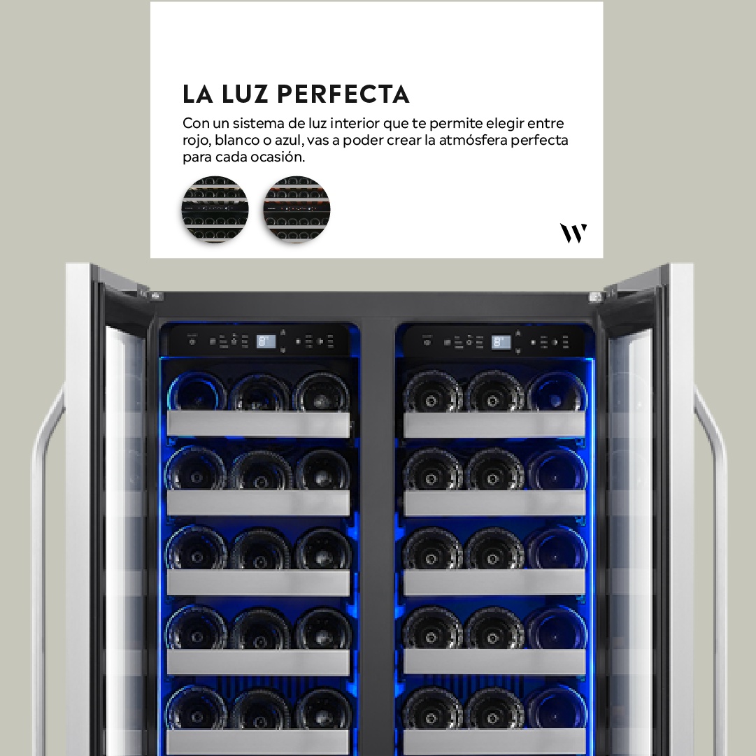 El modelo WMN54D tiene doble temperatura, permite regularla entre 5ºC a 18ºC, según el tipo de vino que desea conservar, una capacidad máxima para 42 botellas.