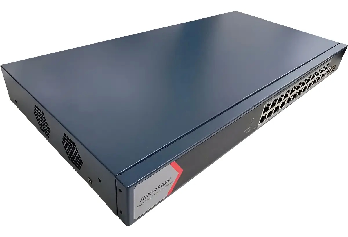 SWITCH HIKVISION ADMINISTRABLE, 24 PUERTOS GIGABIT POE + 2 SFP FIBRA, MANEJO DE VLAN, RACKEABLE.